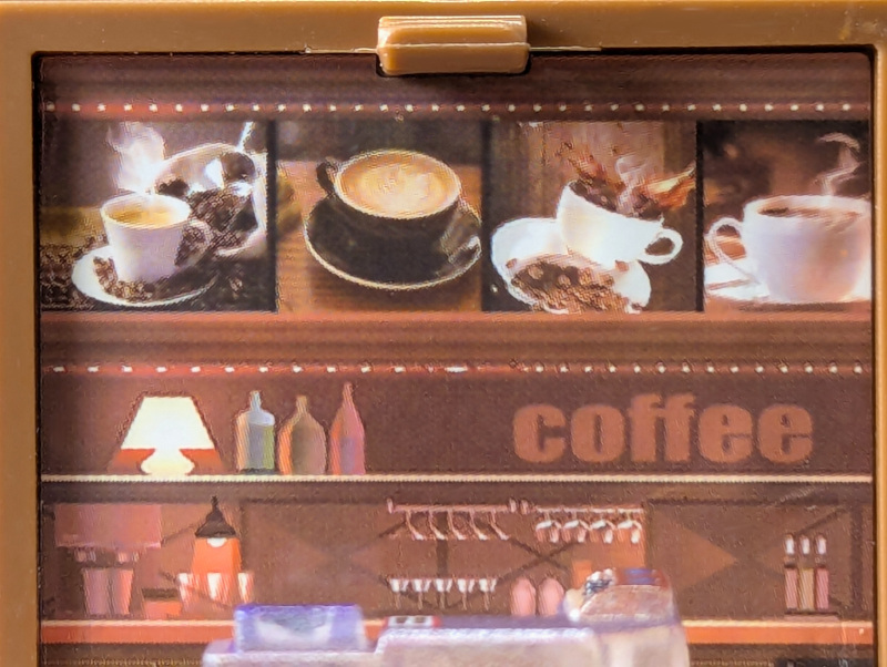 背景もコーヒーメニューの写真に棚に食器と